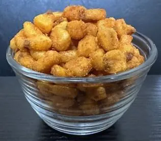 Toasted Corn is golden colored, oil roasted, coated with a dry powder seasoning (topical seasoning application).
